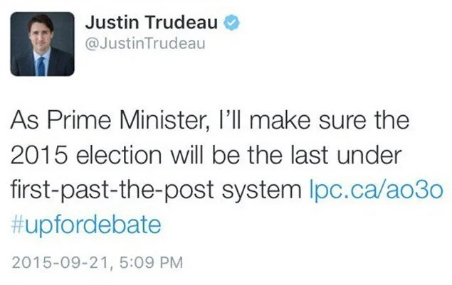 Trudeau tweet from 2015 promising electoral reform, before backtracking after winning power.