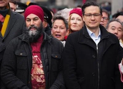 NDP and Conservative leaders stand next to each other at an event in 2023.